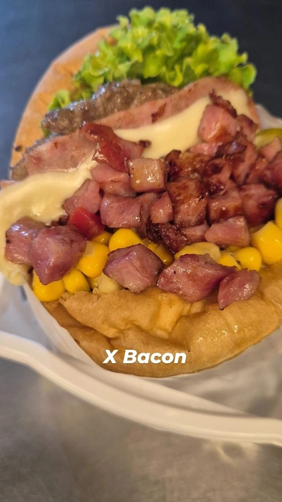 Pão, hambúrguer 110 gr, Bacon, queijo, presunto, alface, tomate, pepino, milho