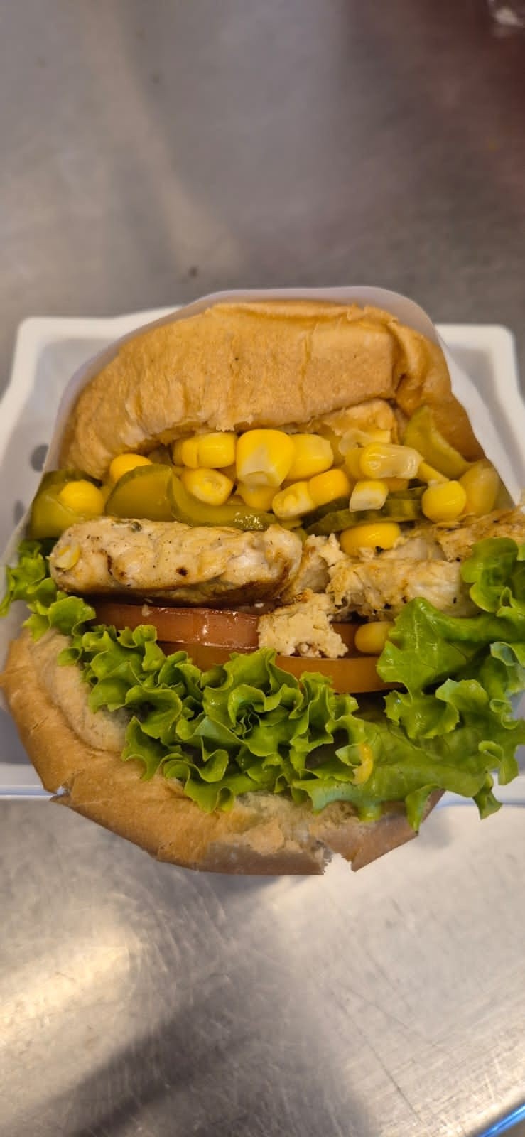 Pão, frango, queijo, presunto, alface, tomate, pepino, milho.