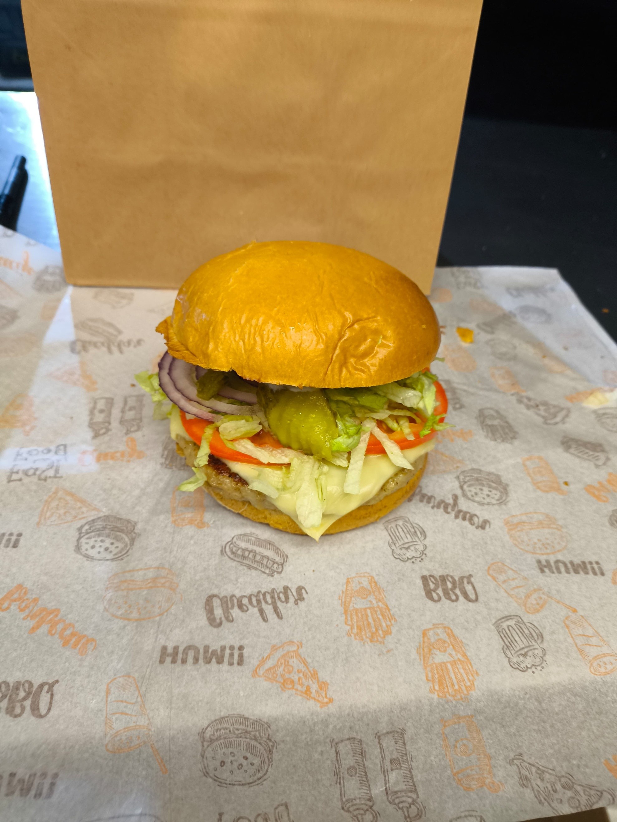 Pão brioche, hambúrguer de 150gr, queijo muçarela, alface, tomate, cebola roxa, picles, maionese da casa