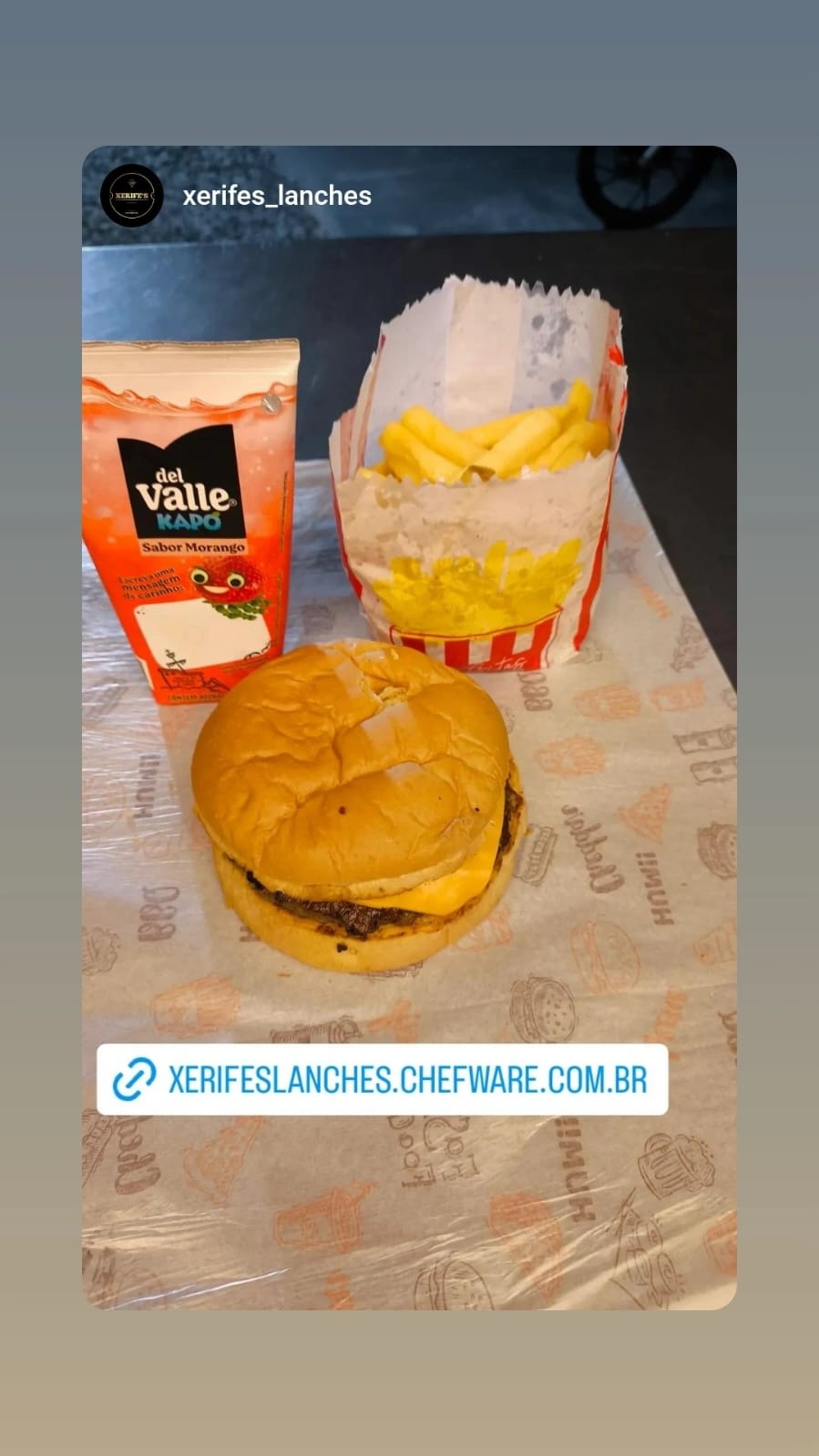 Pão brioche, hambúrguer 110 gr, cheddar, fritas, suco kapo