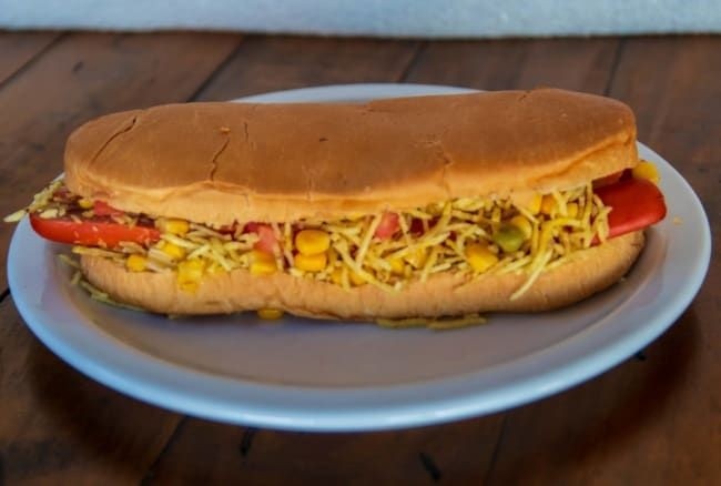 Pão, 2 salsichas, catupiry, cheddar, vinagrete, milho, maionese, ketchup, batata palha