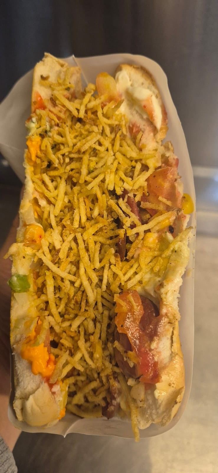 Pão, 2 salsichas, frango, bacon, calabresa, catupiry, cheddar, vinagrete, milho, maionese, ketchup, batata palha