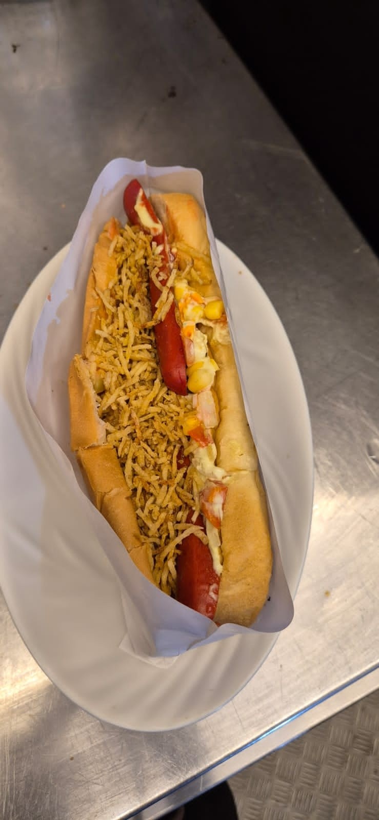 Pão, 2 salsichas, frango, catupiry, cheddar, vinagrete, milho, maionese, ketchup, batata palha
