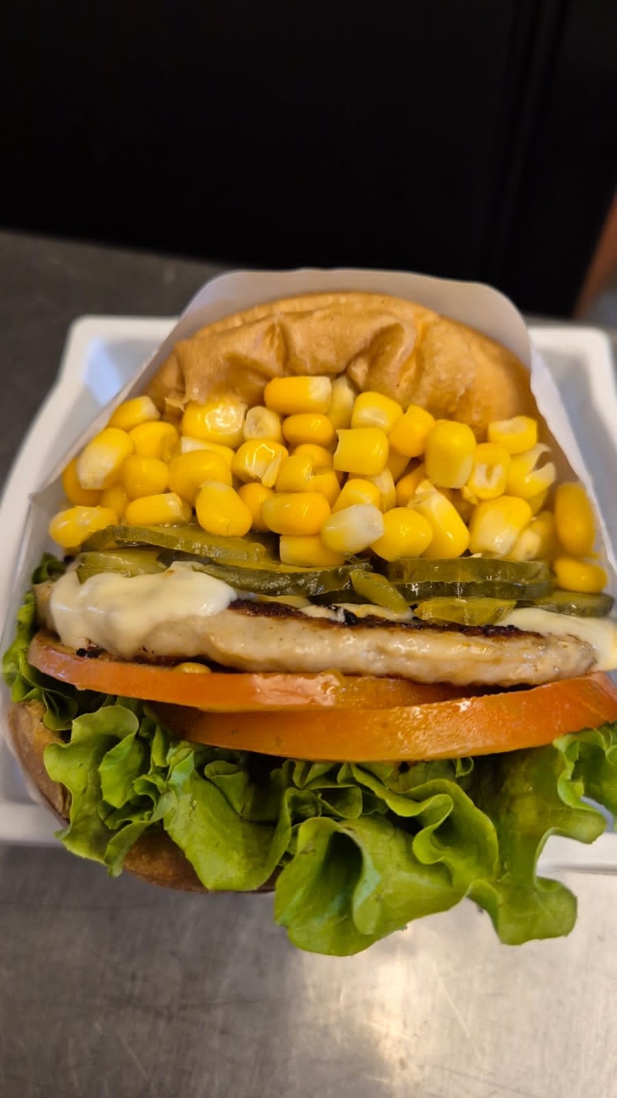 Pão, hamburguer de frango 120 Gramas, queijo, alface, tomate, pepino, milho