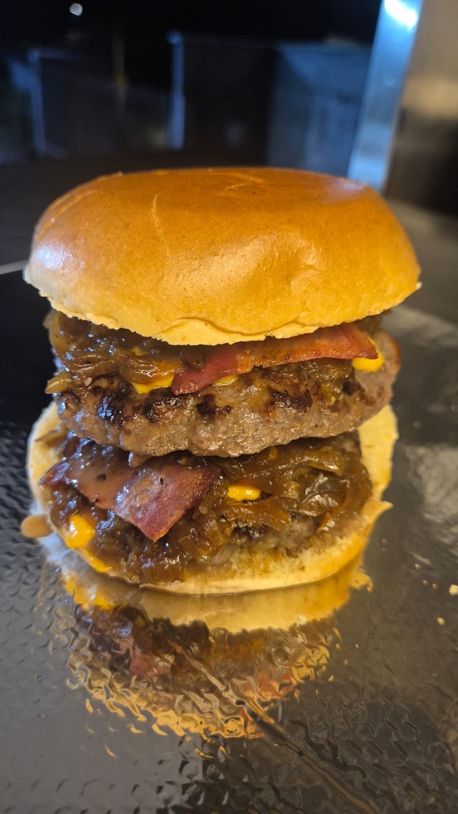 Pão brioche, 2 hambúrguer 150 gr de Costela, Cheddar, cebola caramelizada, Bacon